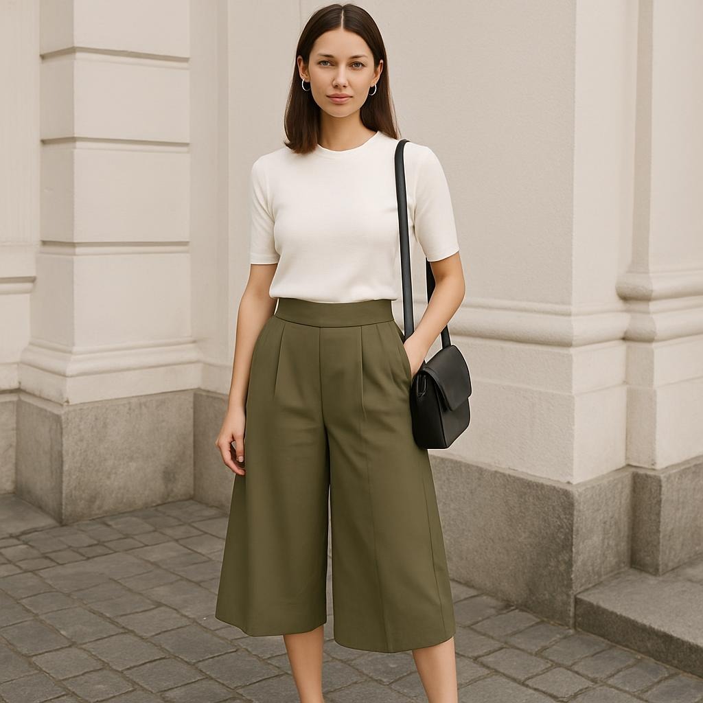 Til et afslappet og ubesværet hverdagslook kan coulottes kombineres med en enkel t-shirt eller tanktop. En tætsiddende overdel hjælper med at skabe balance, da bukserne i sig selv er voluminøse. Sneakers eller flade sandaler giver outfittet et sporty og moderne præg. Du kan også tilføje en denimjakke for at understrege det afslappede udtryk.